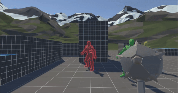 Basic enemy AI with debug menus, health/shield system, and ragdoll death.
